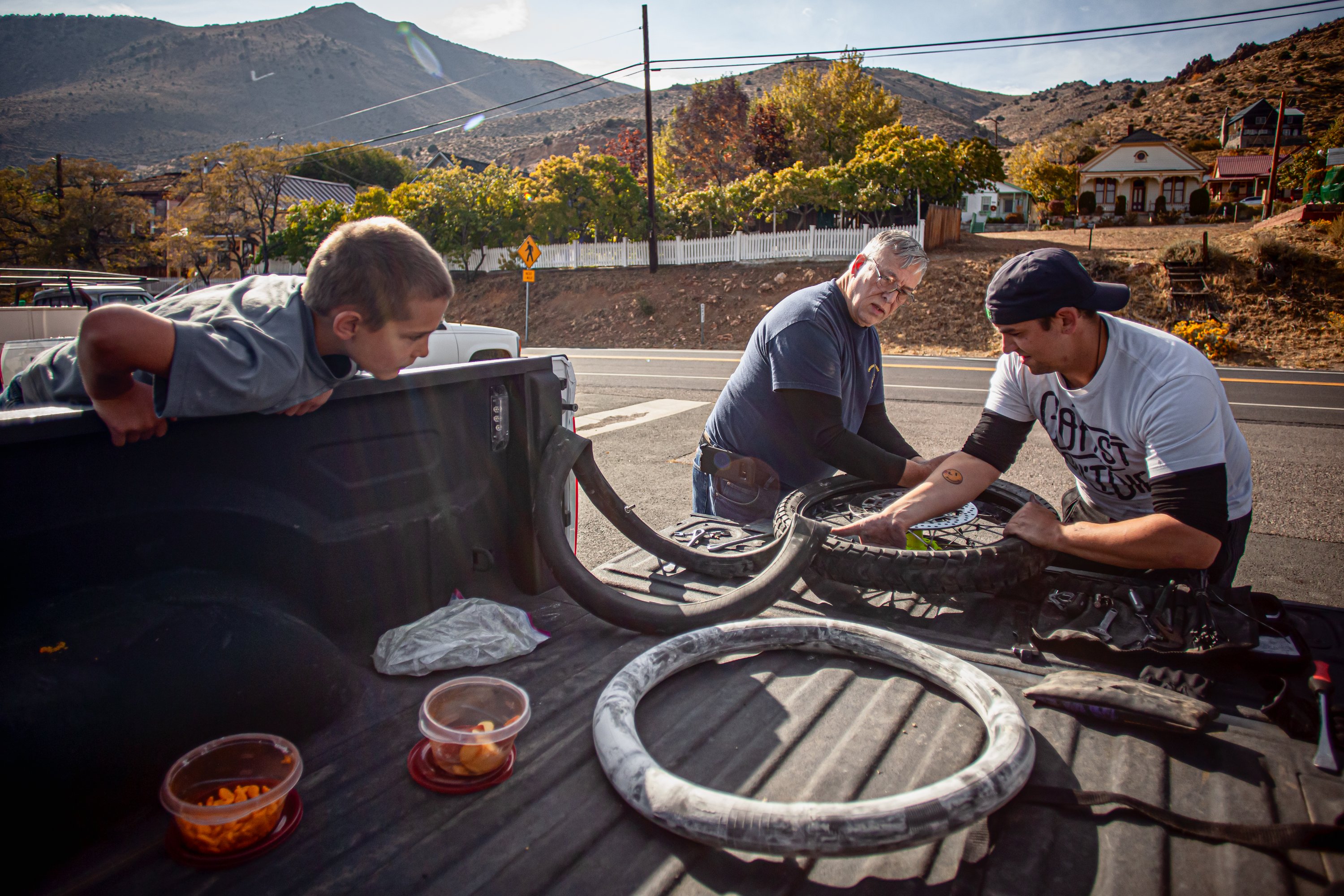 So, we were told the pavement between fernley and virginia city was “pretty gnarly”, plus the idea of riding fernley-virginia city-lake tahoe- fallon- fernley (about 260 miles, plus walking around) was a bit much for my dad, who honestly hasn’t even sat on a bike since 2016. So we loaded the z1000 into the truck, and I rode the tiger. About halfway there, I noticed the front tire felt a little funny. Sure enough, next stop sign, flat. Drat. Oh, and I distinctly remember cleaning out the tools out of the back of the truck the previous day. Welp, luckily, I had brought a spare motorcycle!