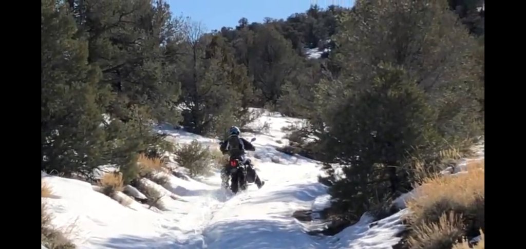 You see, we manhandled three 550+ pound adv bikes uphill through the snow. Because Arrogance. Also…. because we previously walked to the top of the peak (marked with the black arrow) saw the trail was bare on the south side (where the sun shines during the day) and we guessed the trail led straight down into Lida, which was a paved road.